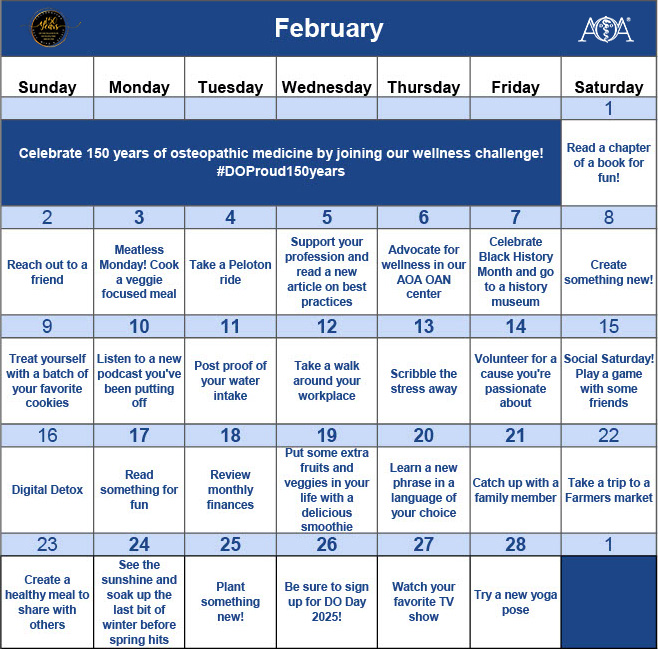 January kicks off our “150 Days of Osteopathic Wellness” challenge, featuring daily goals and activities focused on caring for your body, mind and spirit. Follow the AOA’s social channels using #DOProud150Years for featured wellness tips and join the challenge by downloading our monthly wellness calendar.